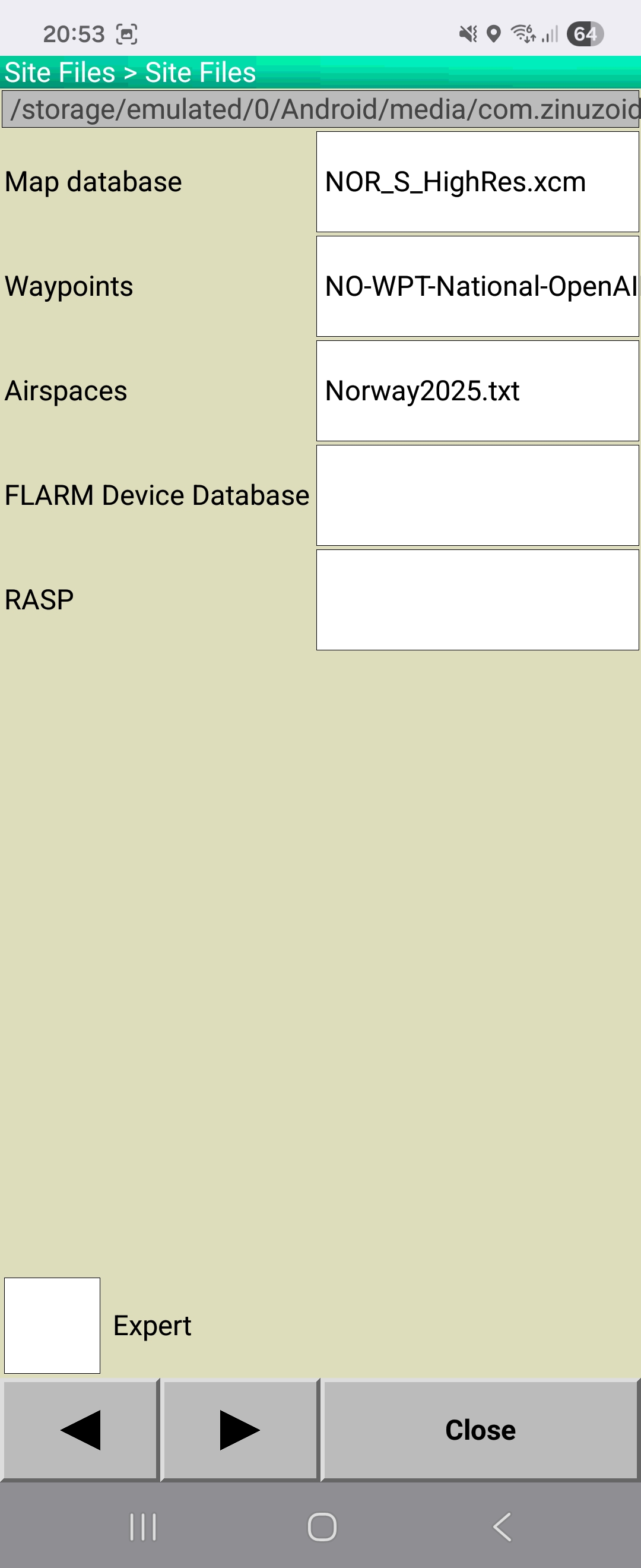 I XCSoar må du laste ned et kart via menyen Config -> System -> Site Files -> Map Database -> Download. Luftrom må også legges til, her er det viktig å sørge for at man selv laster ned oppdatert norsk luftrom og ikke bruker mulig utdaterte luftromsfiler. Luftromsfiler lastes ned fra NLFs konkurranseweb https://booking.seilfly.no/ (under Dokumenter, last ned i OpenAir format til din telefon). Du vil få en fil som heter Norway2026.txt eller lignende. Denne må så flyttes inn i XCSoars mappe. Dette gjøres via en File Manager app på telefonen din; flytt Norway2026.txt fra Downloads mappen og til “Internal Storage / Android / Media / com.zinuzoid.xcsoar_jet” (eller lignende mappe som heter xcsoar). Deretter restarter du XCSoar appen, og du kan nå velge luftromsfilen.